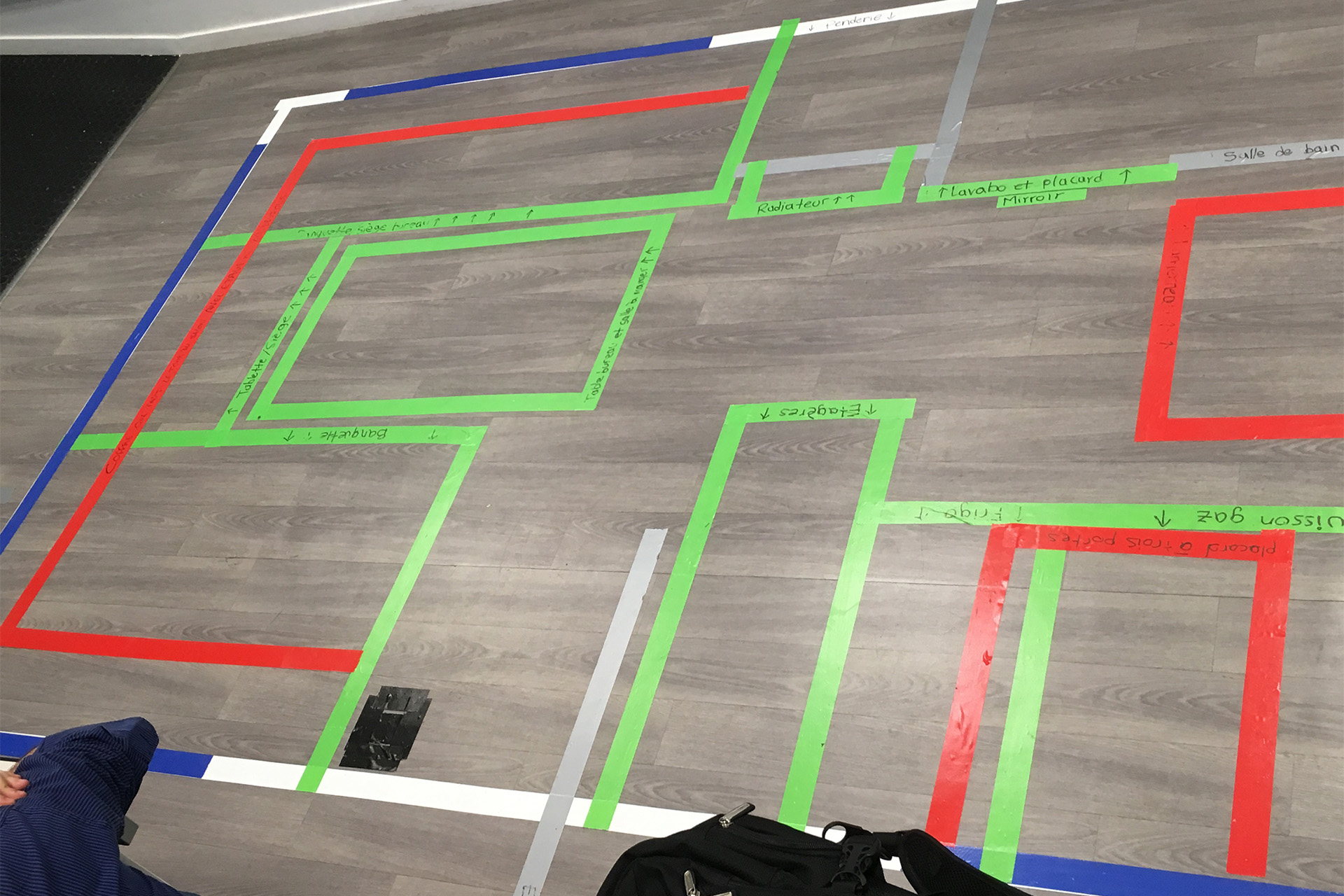 Avec l’aide du plan dessiné auparavant par l’équipe pédagogique, les étudiants ont d’abord tracé au sol la caravane d’Alexandra à échelle 1 dans la salle de cours. Une fois la caravane dessinée, les élèves ont rejoint leurs groupes de travail, qui se sont par la suite entretenus avec Alexandra en s’appuyant bien évidemment sur leurs questionnaires créés au cours précédent. Chaque groupe était ainsi composé d’un rédacteur, qui restitue le contenu de l’entretien, un orateur, qui pose les questions et deux dessinateurs, qui produise des esquisses en complément de la restitution écrite. Tous les rédacteurs, tous groupes confondus, écrivent sur un même document en ligne (googledoc), structuré au préalable par le VRAP (avec un sommaire découpé en quatre partie, dont la Vision, la Relation, l’Action, et la Perception). Ainsi, le brief design fut co-construit en temps réel pendant l’entretien par les étudiants.