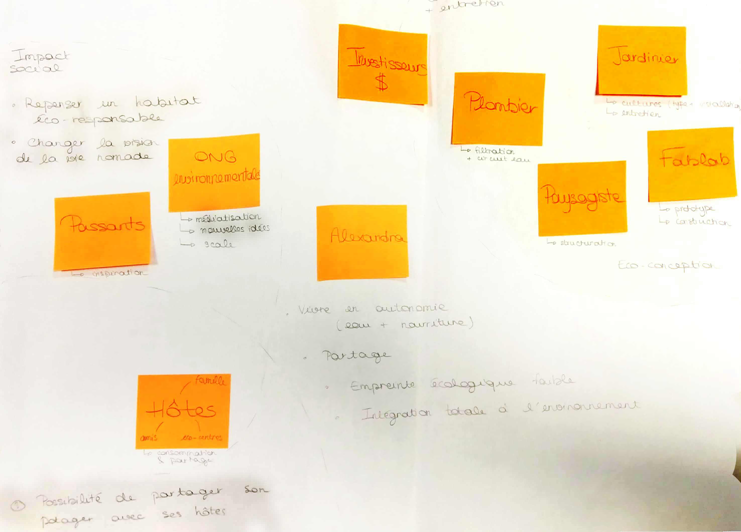 Une fois l’entretien restitué, les étudiants ont commencé à définir des positionnements de projets. Chaque groupe a eu pour mission de développer une approche, une piste de projet. Par exemple, certains ont travaillé sur le travail en mobilité, d’autres sur l’énergie ou encore sur l’espace. L’élaboration des positionnements s’accompagne d’esquisses et d’une argumentation construite à partir de l’entretien. Les groupes ont ainsi débuté un travail créatif collectif ken produisant diverses propositions sous forme de croquis.