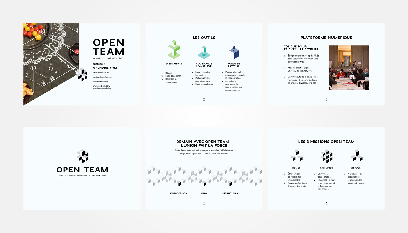 Open Team a consitutié son équipe qui se prépare à rencontrer et à fédérer une multitude d’entrepreneurs sociaux du monde entier. Des voyages aux quatre coins du monde se préparent, les besoins de communication et de supports de communication se manifestent rapidement. Il est temps de créer une identité propre à cette communauté et un discours, une promesse propre au projet d’Open Team. Nous avons alors conçu et réalisé dans un premier temps cette charte graphique d’Open Team, qui présente les différents éléments et règles graphiques pour travailler l’identité de l’organisation.