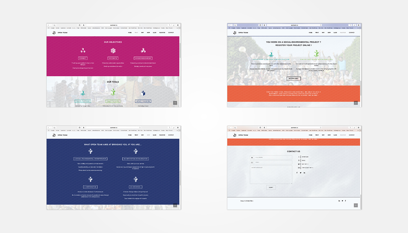 Une fois la charte graphique réalisé, plusieurs supports de communication devait être réalisé pour présenter et communiquer le projet, notamment dans le cadre de leurs événements (Open Chateau, Scale Camp, etc) ou leurs déplacements à travers le monde (Paris, Washington, Marrakech et autres lieux). Avec l’aide de la charte graphique, nous avons réalisé les différents supports et outils de communication d’Open Team, dont la vidéo, le site vitrine, le document de présentation et les cartes de visite. Cette mission, à forte dimension stratégique, a consisté aussi à créer le language et l’esprit d’Open Team, en choissisant les mots et en croisant les expériences de chaque membre de l’équipe.